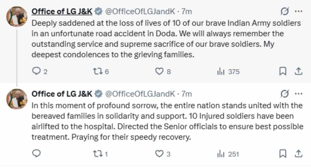 हादसे पर उपराज्यपाल मनोज सिन्हा की तरफ से कहा गया है कि डोडा में हुए दुखद सड़क हादसे में हमारे 10 बहादुर भारतीय सेना के जवानों की जान जाने से बहुत दुख हुआ है। हम अपने बहादुर सैनिकों की बेहतरीन सेवा और सर्वोच्च बलिदान को हमेशा याद रखेंगे। शोक संतप्त परिवारों के प्रति मेरी गहरी संवेदनाएं हैं। इस गहरे दुख की घड़ी में पूरा देश शोक संतप्त परिवारों के साथ एकजुटता और समर्थन में खड़ा है। 11 घायल सैनिकों को एयरलिफ्ट करके अस्पताल पहुंचाया गया है। उनका सबसे अच्छा इलाज हो इसका निर्देश दिया गया है। उनके जल्द ठीक होने की प्रार्थना कर रहा हूं।