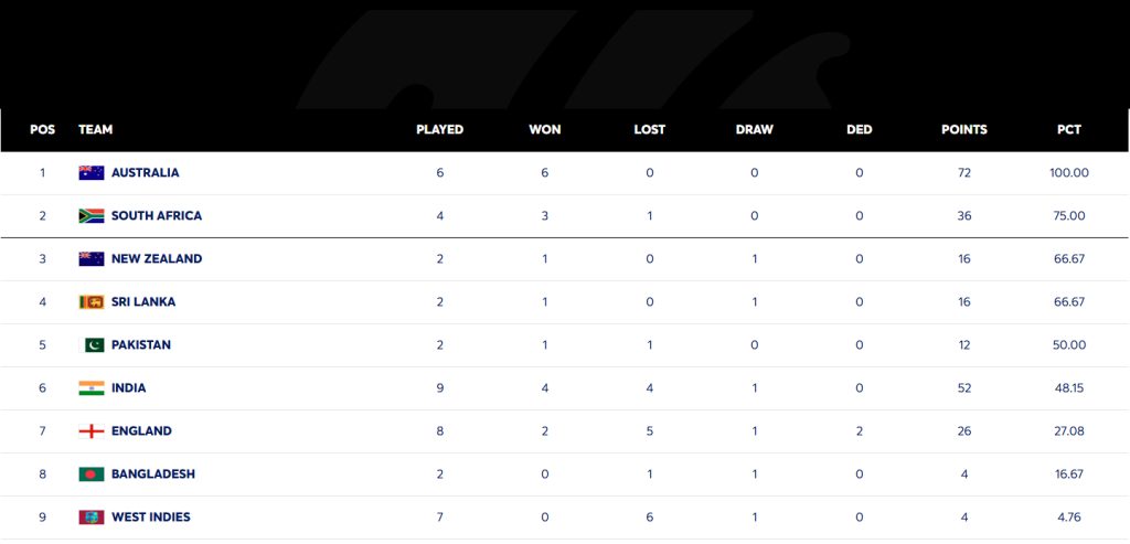 साउथ अफ्रीका की टीम भी शानदार फॉर्म में चल रही है और वह अंकतालिका में दूसरे स्थान पर बनी हुई है। प्रोटियाज टीम ने अब तक 4 मैच खेले हैं, जिनमें से 3 में जीत और 1 में हार मिली है। उसका PCT 75.00 प्रतिशत है, जो उसे फाइनल की रेस में मजबूत स्थिति में रखता है।