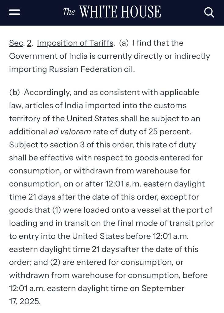 ट्रम्प ने अपने एग्जीक्यूटिव ऑर्डर में लिखा है- “भारत सरकार प्रत्यक्ष और अप्रत्यक्ष तरीके से रूस से तेल आयात कर रही है। ऐसे में अमेरिका में दाखिल होने वाले भारत के सामानों पर 25% एक्स्ट्रा टैरिफ लागू होगा। हालांकि कुछ खास परिस्थितियों में इस टैरिफ से छूट भी दी जाएगी जैसे कि यदि कोई सामान पहले ही समुद्र में लद चुका है और रास्ते में है, या यदि वह कुछ खास तारीख से पहले अमेरिका में पहुंच चुका है।