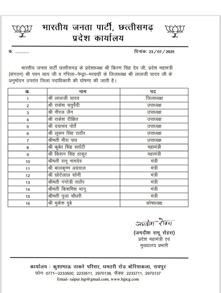 बीजेपी की नई जिला कार्यकारिणी घोषित : अध्यक्ष, जिला उपाध्यक्ष, महामंत्री और जिला मंत्री बनाए गए, देखें लिस्ट…