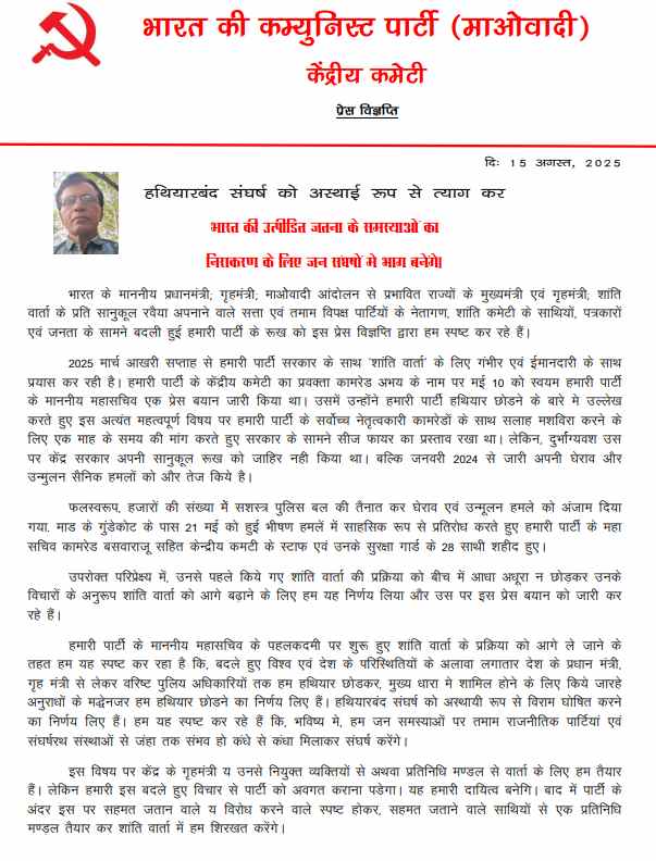 नक्सलियों की केंद्रीय कमेटी के प्रवक्ता अभय की ओर से जारी पत्र में कहा गया है कि 2025 मार्च आखरी सप्ताह से हमारी पार्टी सरकार के साथ ‘शांति वार्ता’ के लिए गंभीर एवं ईमानदारी के साथ प्रयास कर रही है. हमारी पार्टी के केंद्रीय कमेटी का प्रवक्ता कामरेड अभय के नाम पर मई 10 को स्वंम हमारी पार्टी के महासचिव एक प्रेस बयान जारी किया था. उसमें उन्होंने हमारी पार्टी हथियार छोड़ने के बारे में उल्लेख करते हुए इस अत्यंत महत्वपूर्ण विषय पर हमारी पार्टी के सर्वोच्च नेतृत्वकारी कामरेडों के साथ सलाह मशविरा करने के लिए एक माह के समय की मांग करते हुए सरकार के सामने सीज फायर का प्रस्ताव रखा था, लेकिन दुर्भाग्यवश उस पर केंद्र सरकार अपनी सानुकूल रूख को जाहिर नहीं किया था, बल्कि जनवरी 2024 से जारी अपनी घेराव और उन्मुलन सैनिक हमलों को और तेज किए हैं.