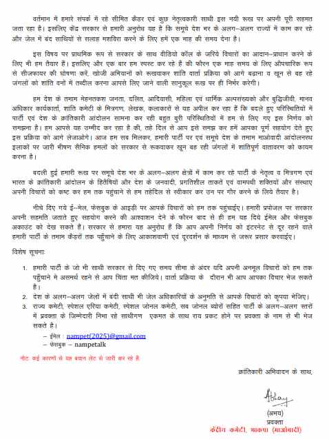 पत्र में आगे कहा गया है कि हजारों की संख्या में सशस्त्र पुलिस बल तैनात कर घेराव एवं उन्मूलन हमले को अंजाम दिया गया. माड के गुंडेकोट के पास 21 मई को हुए भीषण हमले में साहसिक रूप से प्रतिरोध करते हुए हमारी पार्टी के महासचिव कामरेड बसवाराजू सहित केंद्रीय कमेटी के स्टाफ एवं उनके सुरक्षा गार्ड के 28 साथी शहीद हुए. इस परिप्रेक्ष्य में उनसे पहले किए गए शांति वार्ता की प्रक्रिया को बीच में आधा अधूरा न छोड़कर उनके विचारों के अनुरूप शांति वार्ता को आगे बढ़ाने के लिए हमनें यह निर्णय लिया है.